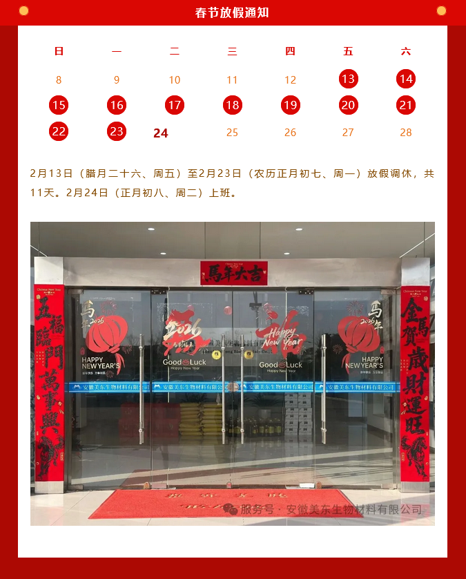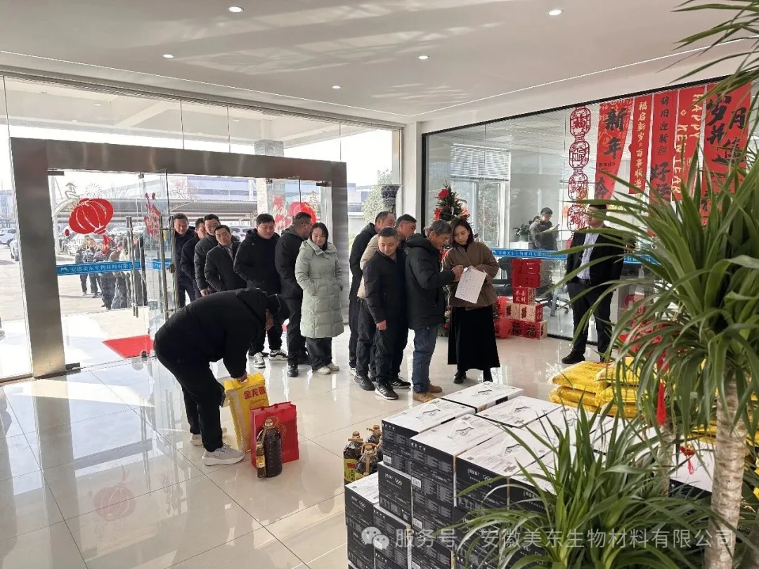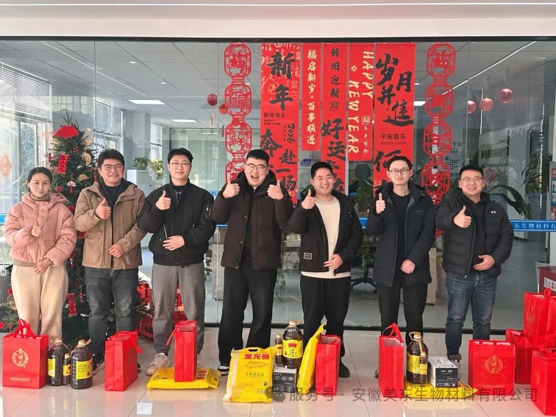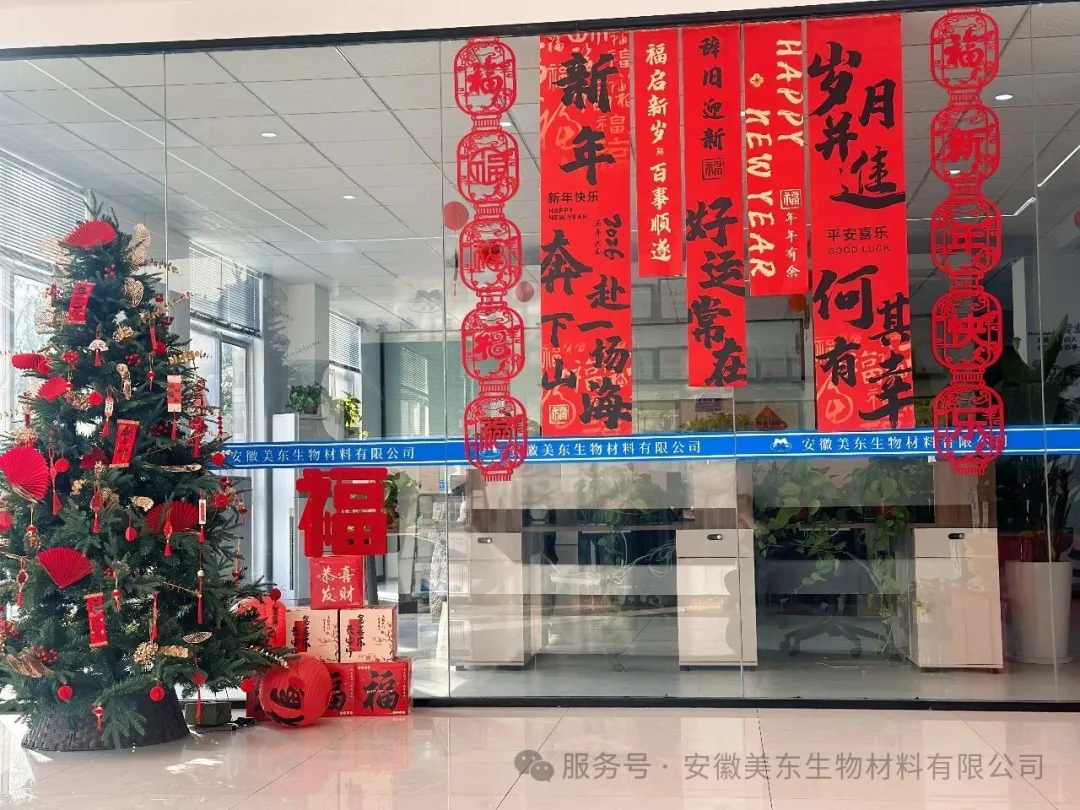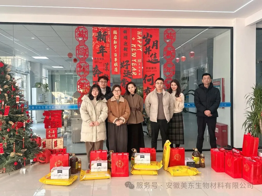 2026年2月12日,安徽美东生物材料有限公司洋溢着节日的喜庆与温馨,公司精心准备的春节福利整齐摆放在大厅,为每位员工送上诚挚的新年祝福。