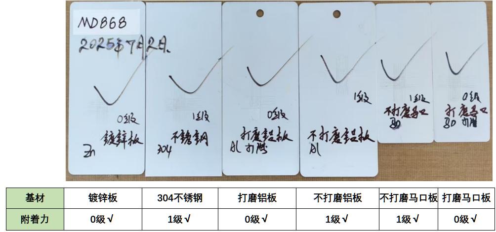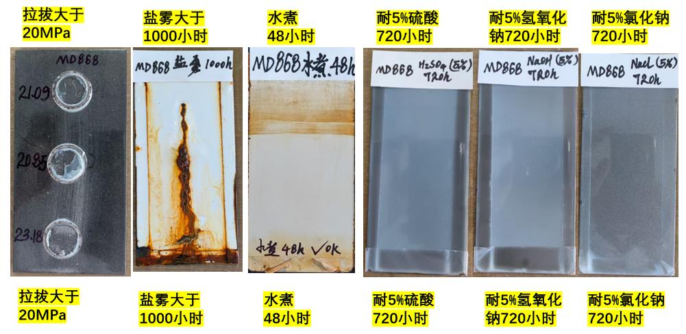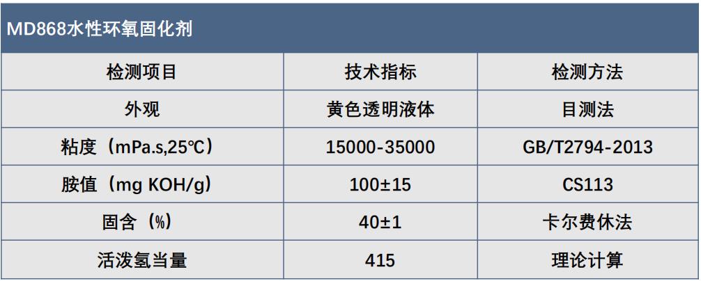 MD868具有:多种基材附着力优;可做90度以上高光泽配方;可搭配多种水性环氧树脂(液体环氧、1型、4型)做双组份自干漆;耐化学性能优异;柔韧性好的特点。