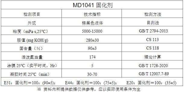 MD1041 是以腰果壳油为主要原料生产的一种改性酚醛胺环氧固化剂,该产品主要用于环氧地坪涂料,具有低温快速固化和潮湿固化、稳定性好、综合性能优异、性价比高等特点。