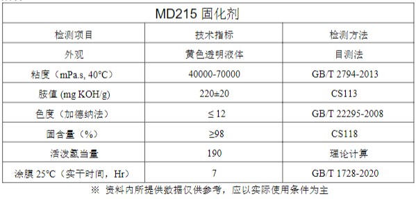 MD215是一款通用性低分子量聚酰胺固化剂,不含溶剂。具有较快的干燥性能、初期耐水性好,机械性能优异、防腐性能极佳,主要用于工业防腐、船舶涂料、胶黏剂、地坪等领域。