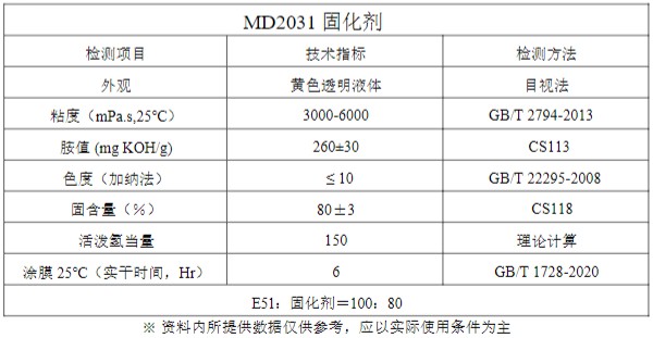 MD2031是一款80%固体份、色泽浅、粘度较低的酚醛酰胺固化剂。这种固化剂除了在湿度高的环境下提供优异的耐水性、附着力、韧性和外观外,还具有优异的低温固化和机械性能,适用于多种环氧防腐体系。