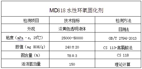 MD818属非离子型水性环氧固化剂,以固体份80%的水溶液形式供货,水溶性好,无溶剂,可与环氧树脂乳液或分散体配合使用,干燥固化快,机械性能好,耐盐雾与防腐性能优异。